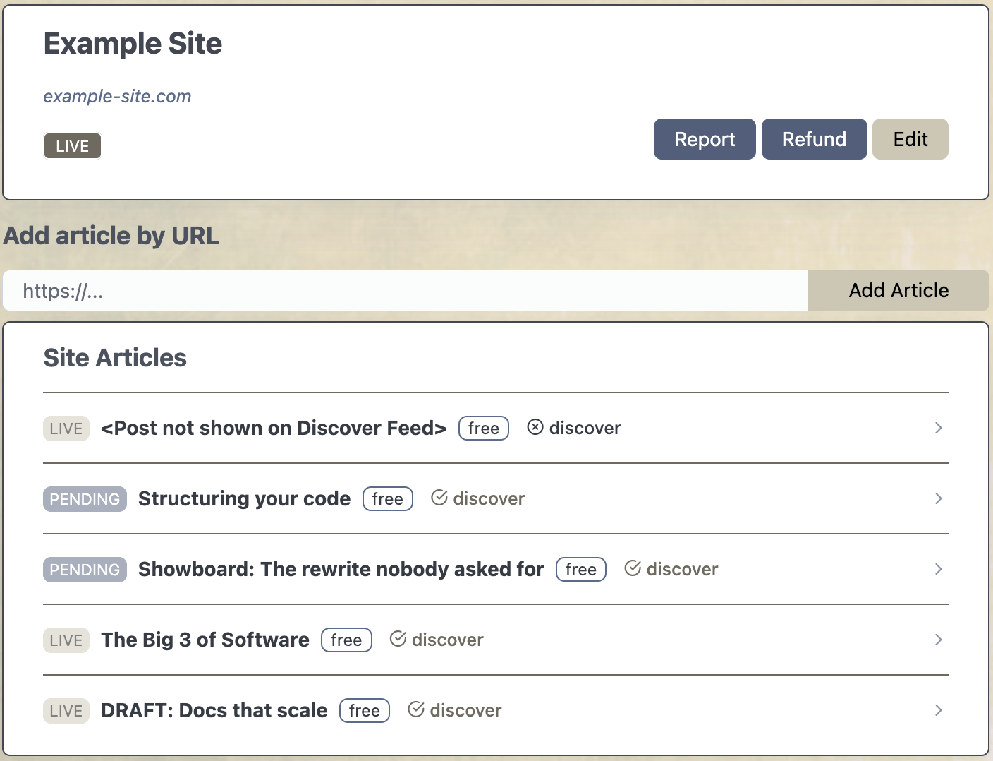 The Discover Feed is an aggregator of all the articles on the Paperwall network. Every article is optionally displayed on this aggregator. So you can have the article registered on Paperwall, and it doesn’t have to show on the discover feed. You can customize look and feel, categories and tags, and customize your own feed.