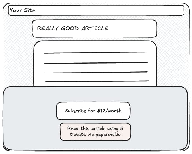 There are many existing paywalls out there, especially on different platforms. The idea here would be a seamless integration with any existing paywall. Imagine something that has a “Subscribe for $X/month”, and underneath it says: “Access this article with Paperwall”. This is where Paperwall would augment any existing subscriptions. If a reader finds they’re reading enough of the content it’s worth a subscription, they can convert with more confidence. It looks something like this: